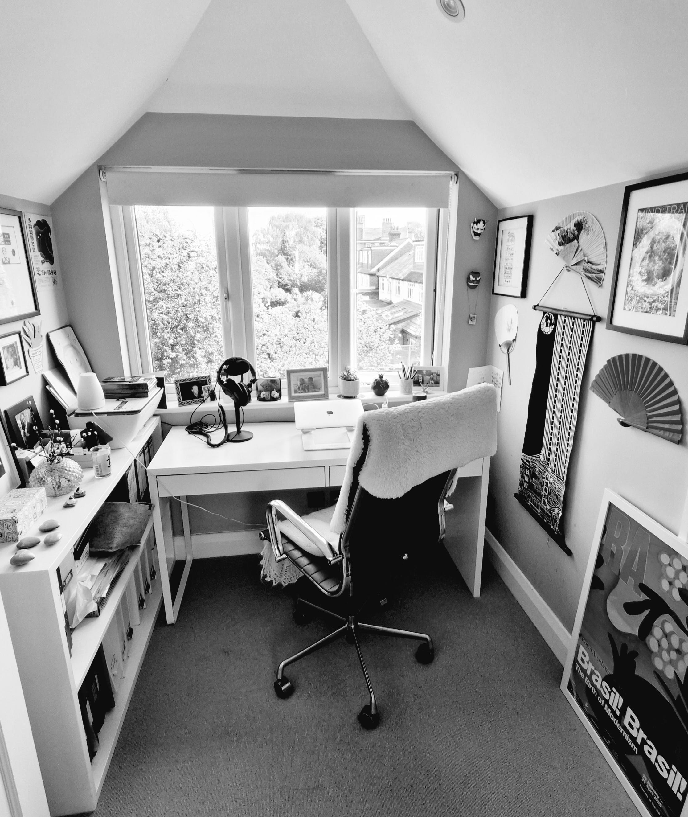 The scent of musky essence in my office, treetops in bloom, skyscrapers afar,